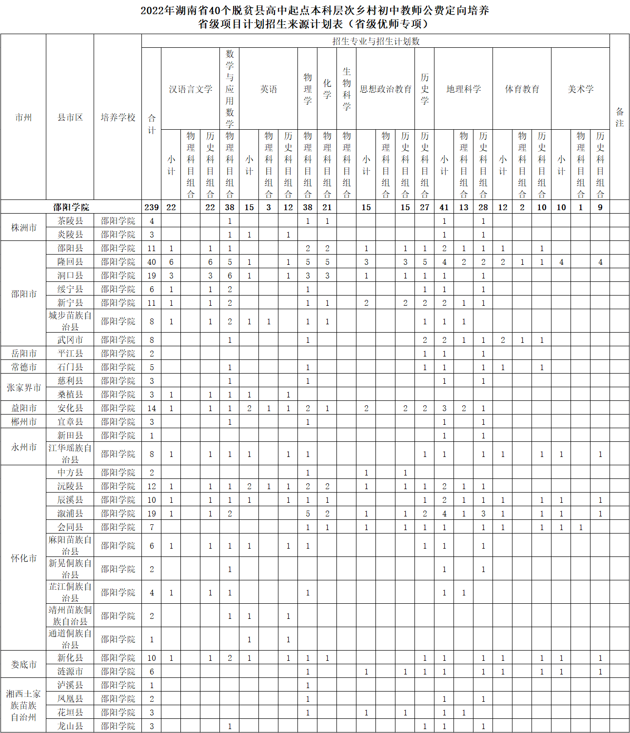 本科层次初中教师公费定向培养招生计划:522人,类型为普通高考招生计划。其中,省级优师专项239人。详见邵阳学院2022年公费定向师范生招生计划表附件1、2。